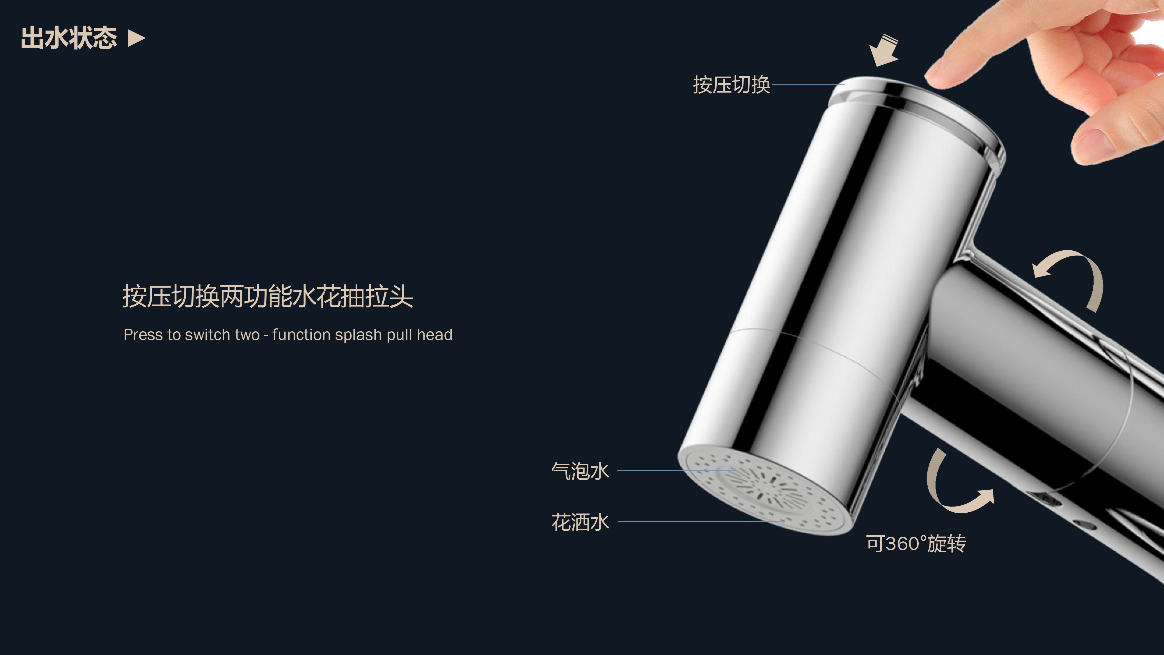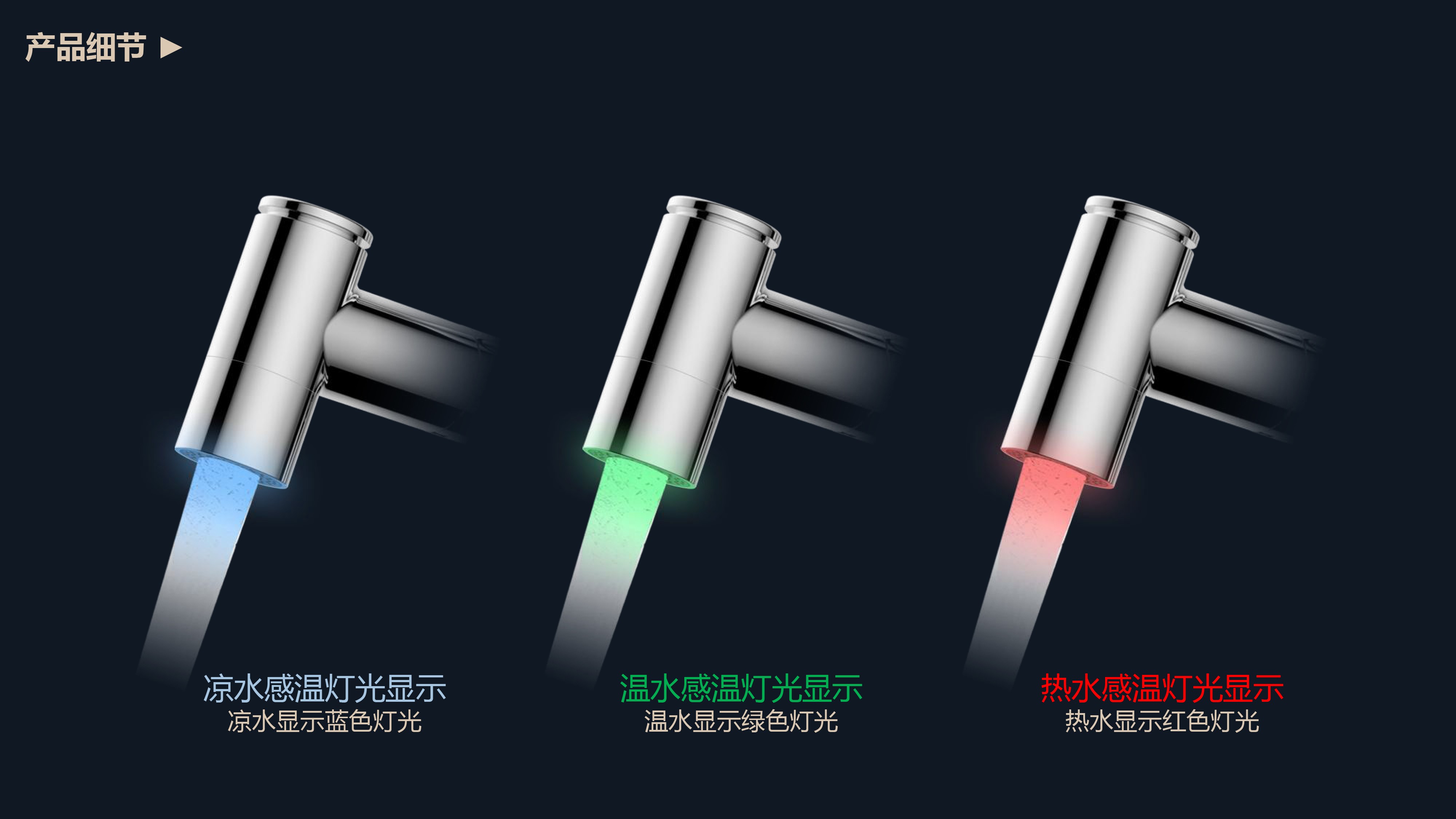 溫感三色LED燈光出水;日常洗頭利器,抽拉出水輕松洗;按壓切換兩功能水花;適合4寸3孔安裝臺(tái)面
